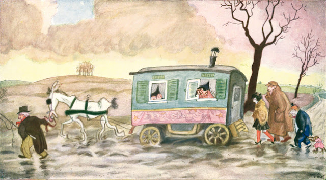 Wenn hinter den Illustrationen Walter Triers in der Regel auch nicht die deutliche Sozialkritik hervorscheint, die die Zeichnungen Heinrich Zilles mit ausmachen, so verbindet die beiden nicht zuletzt ein herzenswarmer und humorvoller Blick auf die Menschen im Alltag in sehr ähnlichen Umfeldern. Beide hatten dabei ein besonderes Faible für die Artisten, den "Rummel, den Circus - kurz das "Fahrende Volk". Umherziehende Circusleute zeichnete Trier gleich mehrfach, wobei in der nachfolgend abgebildeten Illustration "Fahrendes Volk" aus "Triers Panoptikum" (1922) jeglicher ironisch-heitere Ton einer völligen Tristesse gewichen ist, wie sie Trier gerade auch im Hinblick auf dieses Metier eigentlich fremd war.